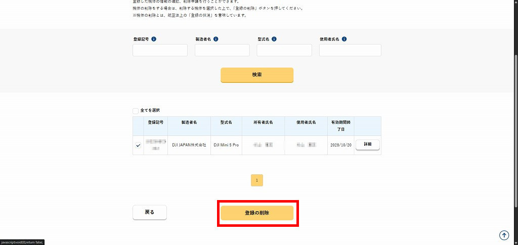 登録を削除(抹消)する機体を探し、左欄にチェックを入れ「登録の削除」を押す