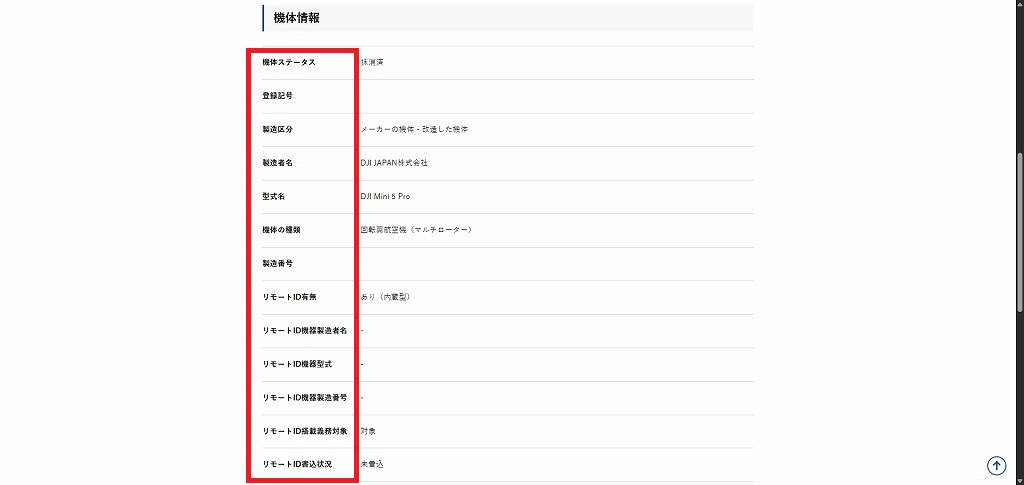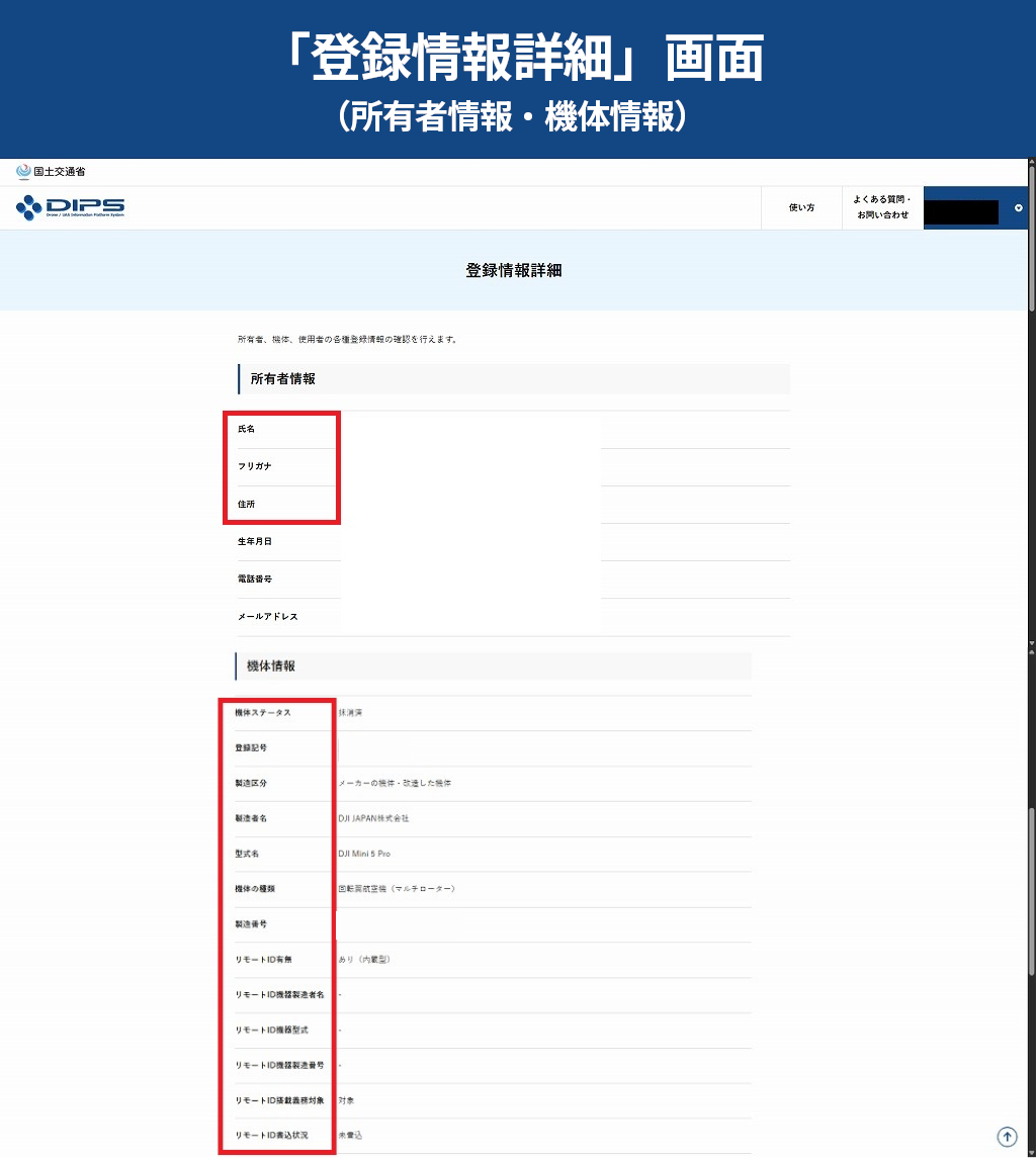 ②登録情報詳細(「所有者情報」と「機体情報」)