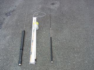 右が常用の第一電波製。真ん中はお客様からお譲り頂いた釣り竿アンテナ、全長は3m少々、これは移動運用用ですね、既製品のような綺麗な工作でした。